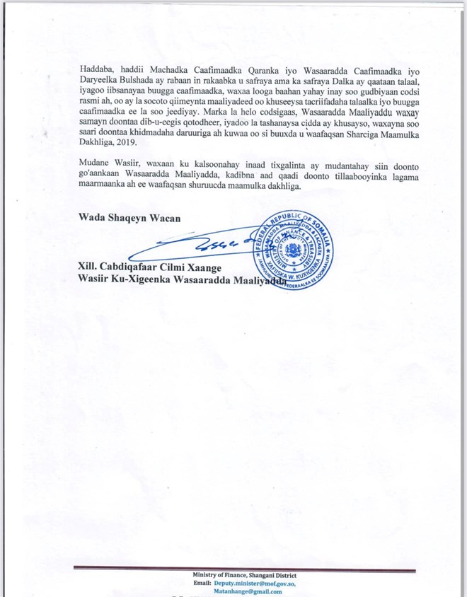 Wasaaradda Maaliyadda Soomaaliya oo joojisay, sharci darrana ku tilmaamtay khidmadaha buugga caafimaadka