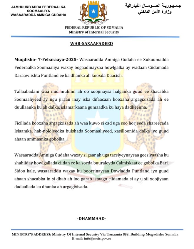 Wasaaradda Amniga Gudaha waxay si gaar ah uga tacsiyeynaysaa geesiyaasha ku shahiiday howlgallada ciidan ee ka socda buuraleyda Calmiskaat ee gobolka Bari ayaa lagu yiri war saxaafadeedka.