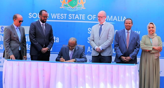 Axad, February 9, 2025 (HOL) – Madaxweynaha Maamulka Koonfur Galbeed Cabdıcasııs Xasan Maxamed Laftagareen ayaa Magaalada Baydhabo ee xarunta KMG ah ee Koofur Galbeed ku Saxiixay Hindise Sharciyeedka Ilaalinta Gargaarka Bani’aadanimada oo ay soo diyaarisay Wasaarada Gargaarka iyo Maareynta Masiibooyinka Koonfur Galbeed.