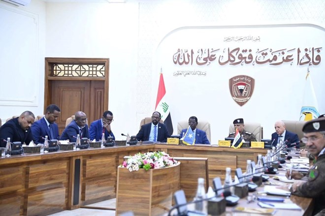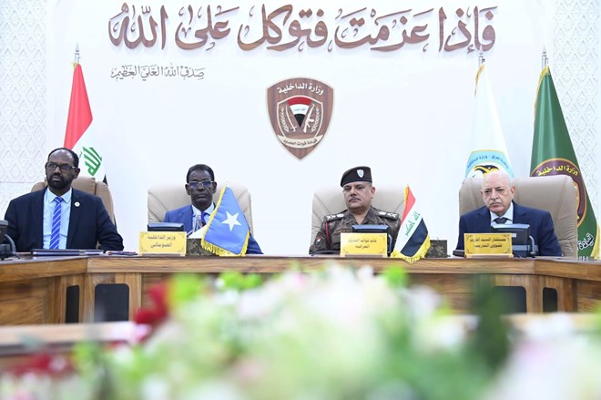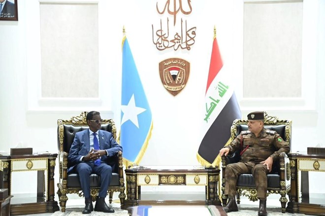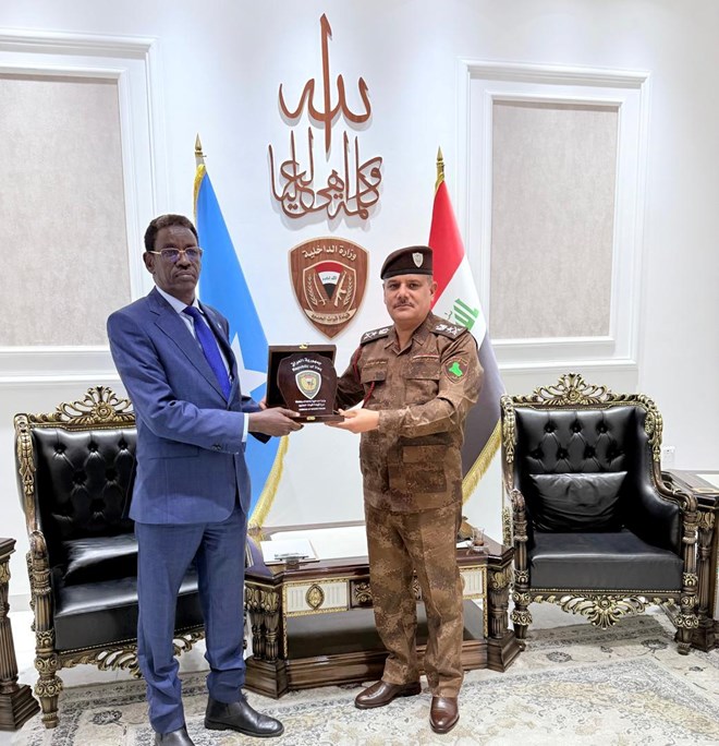 Talaado, January 14, 2025 (HOL) – Wasiirka Wasaaradda amniga Xukuumadda Fedaraalka Soomaaliya Cabdullaahi Sheekh Ismaaciil Fartaag oo ay wehlinayaan taliye ku xigeenka ciidanka Booliiska Soomaaliya Jeneraal Cabdalla Cabdalla, Agaasimaha guud ee Wasaradda Amniga Yuusuf Cali iyo Safiirka Soomaaliya ee u jooga dalka Ciraaq Ridwaan Xirsi Maxamed ayaa booqasho rasmi ah ku tagay xarunta taliska ciidamada ee dowladda Ciraaq.