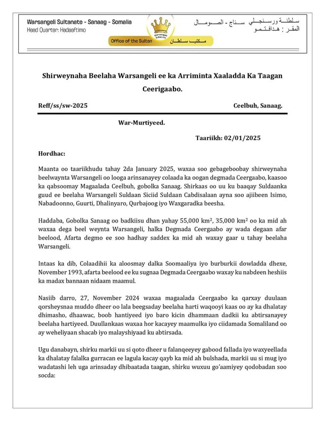 Khamiis, January 2, 2025 (HOL) – Shir beelaha Warsangali uga socday deegaanka Ceelbuh ee gobolka Sanaag, oo ay beeshu kaga arrinsanaysay xasaradihii dhawaanahan ka dhacay magaalada Ceerigaabo, ayaa lagu go’aamiyey in beeshu ay difaacdo shacabka iyo hantida ay ku leedahay magaalada.