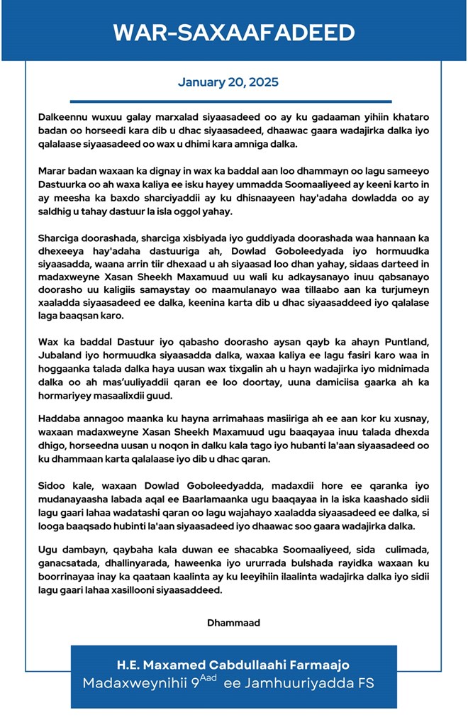 “Wax ka baddal Dastuur iyo qabasho doorasho aysan qayb ka ahayn Puntland, Jubaland iyo hormuudka siyaasadda dalka, waxaa kaliya ee lagu fasiri karo waa in hoggaanka talada dalka haya uusan wax tixgalin ah u hayn wadajirka iyo midnimada dalka oo ah mas’uuliyaddii qaran ee loo doortay, uuna damiciisa gaarka ah ka hormariyey masaalixdii guud.” ayaa lagu yiri war saxafadeedka uu soo saaray Madaxweynihii hore ee Soomaaliya.