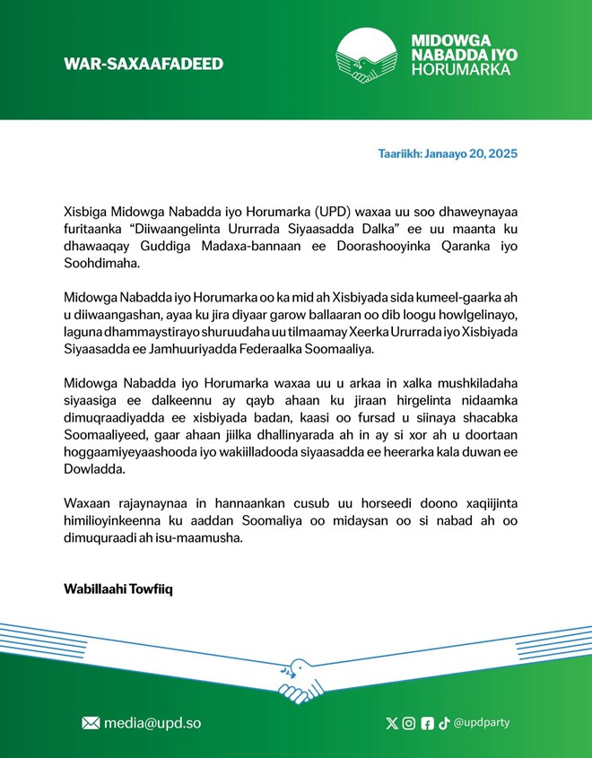 Hadalka UPD waxa uu imaanayaa iyadoo Shalay ay Guddiga Doorashooyinka Federaalka ay bilaabeen diiwaangelinta ururada ka jira dalka kuwa cusub iyo kuwii hore ee la diiwaangeliyay.