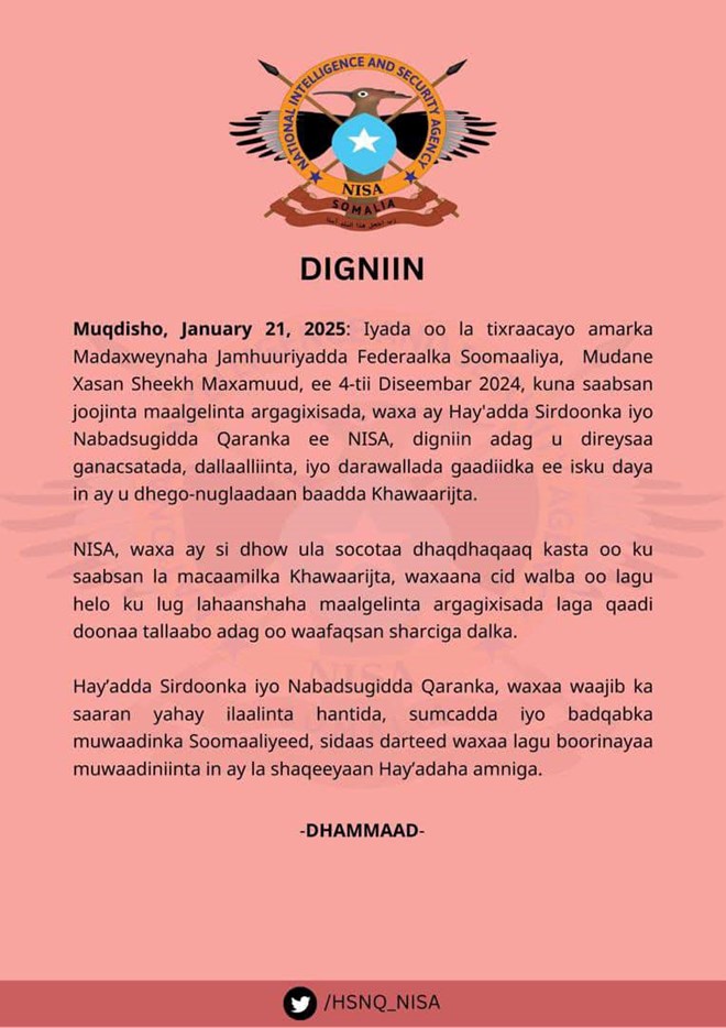 NISA waxay shaaca ka qaaday in si dhow loola soconayo dhaqdhaqaaqyada la xiriira la macaamilka Alshabaab, waxayna sheegtay in cid walba oo lagu helo ku lug lahaanshaha maalgelinta argagixisada laga qaadi doono tallaabo adag oo waafaqsan sharciga dalka.