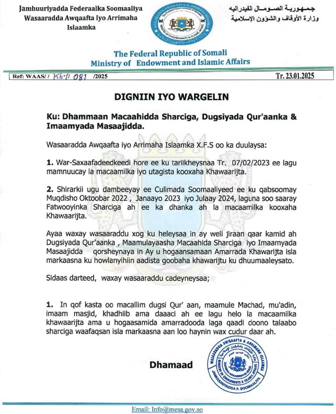 Si kastaba ha ahaatee amarkaan kasoo baxay Wasaaradda Awqaafta iyo arrimaha Islaamka ayaa kusoo aadaya, iyadoo maanta Wasaaradda Ganacsiga iyo Warshadaha Soomaaliya soo saartay dhankeeda amaro loogu digayo Ganacsatada Soomaaliyeed iney xiriir la sameeyaan kooxda Al-Shabaab.