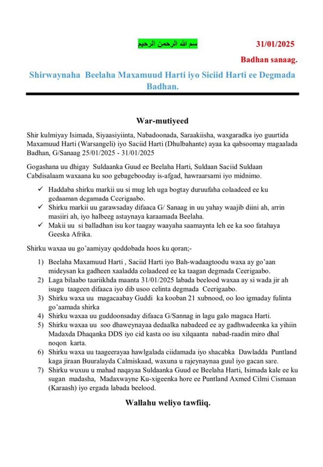 Warmurtiyeedka shirka ayaa lagu caddeeyey in labada beelood ay go’aansadeen inay la wareegaan gacan ku haynta magaalada Ceerigaabo. “Laga bilaabo taariikhda maanta, labada beelood waxay si wadajir ah isugu taageen difaaca iyo soo celinta degmada Ceerigaabo,” ayaa lagu yidhi bayaanka shirka.