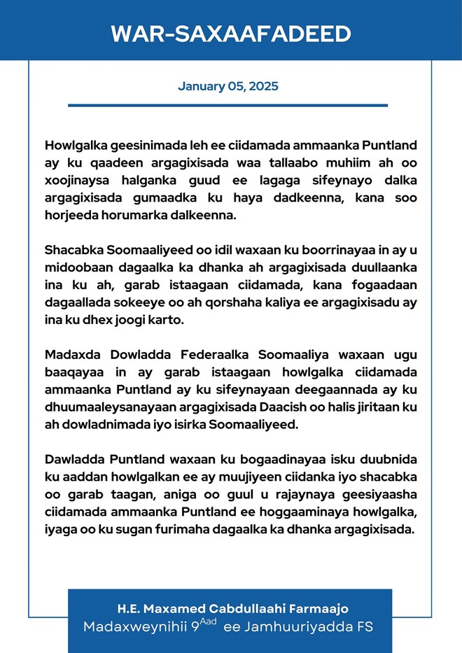 Axad, January 5, 2025 (HOL) – Madaxweynihii hore ee Soomaaliya Maxamed Cabdullahi Farmaajo ayaa bogaadiyay Howlgalka ay ciidamada ammaanka Puntland ay ku qaadeen Kooxda Daacishta Soomaaliya, waxaana uu ku tilmaamay tallaabo muhiim ah oo xoojinaysa halganka guud ee lagaga sifeynayo dalka argagixisada.