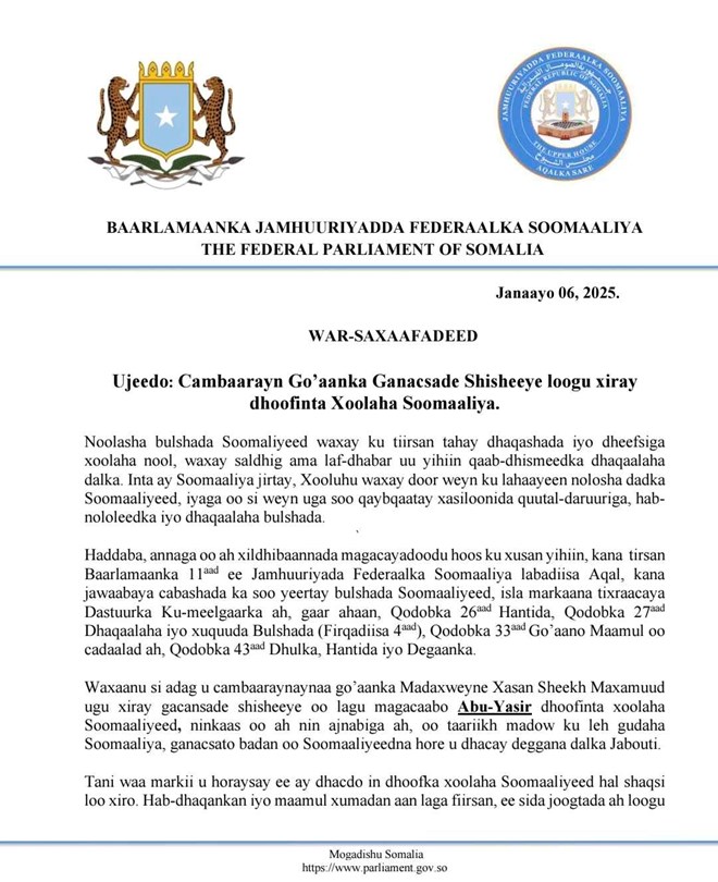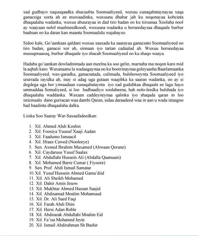 Bayaanka xildhibaanadaan ay soo saaren waxa ay ku yiraahdeen “Waxaanu si adag u cambaaraynaynaa go’aanka Madaxweyne Xasan Sheekh Maxamuud ugu xiray gacansade shisheeye oo lagu magacaabo Abu-Yasir dhoofinta xoolaha Soomaaliyeed, ninkaas oo ah nin ajnabiga ah, oo taariikh madow ku leh gudaha Soomaaliya, ganacsato badan oo Soomaaliyeedna hore u dhacay deggana dalka Jabouti”.