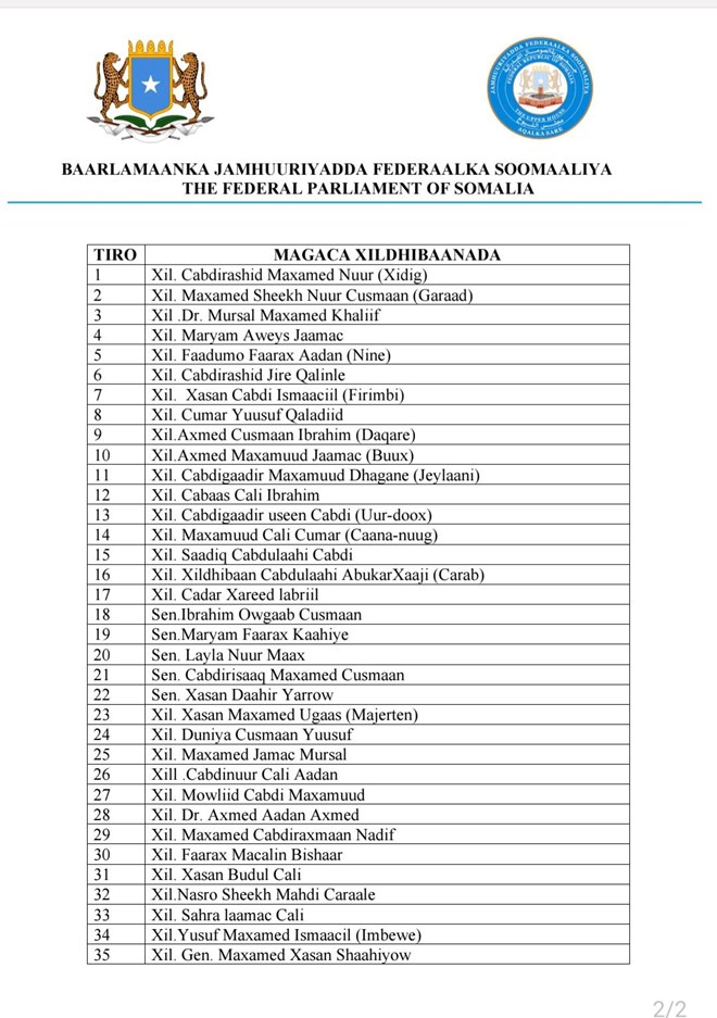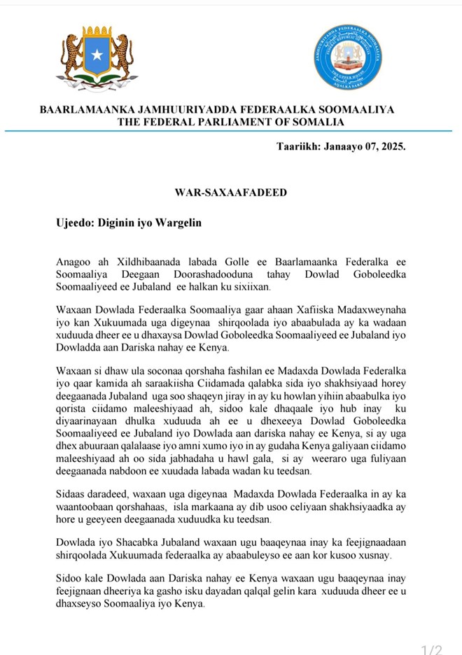 Ugu dambeyn waxa ay xildhibaanadaan bayaan koodi ugu baaqeen Dowlad Goboleedka Jubaland iyo Shacabka Jubaland inay ka feejignaadaan Shirqoolo ay sheegen inay Xukuumada federaalka ka abaabuleyso degaanada Jubaland.