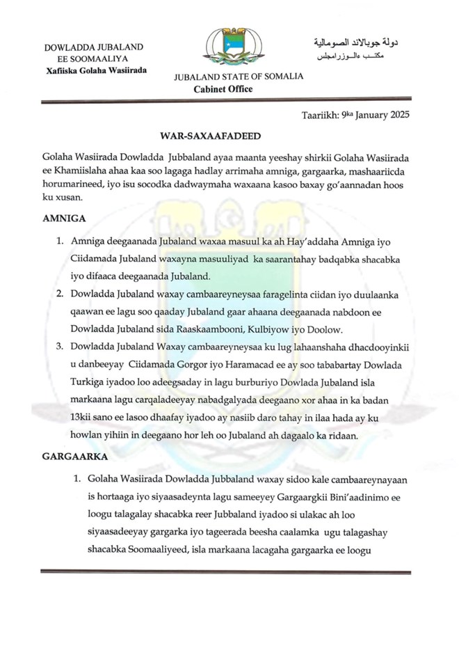 Khamiis, January 9, 2025 (HOL) – Golaha Wasiirada Dowlad Goboleedka Jubbaland oo maanta yeeshay shirkoodi Khamiislaha ayaa looga hadlay arrimaha amniga, gargaarka, mashaariicda horumarineed, iyo isu socodka dadwaymaha waxaana kasoo baxay dhowr qodob iyo eedeymo culus loo jeediyay Dowladda Soomaaliya.