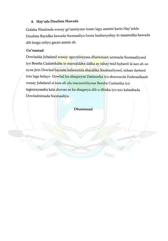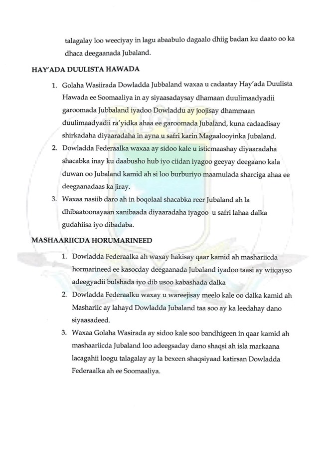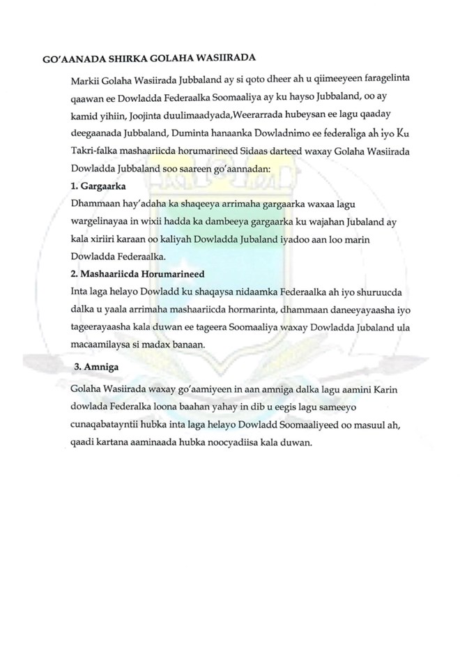 Ugu dambeyntii waxa ay Golaha wasiirada Jubbaland ay Dhammaan hay’adaha ka shaqeeya arrimaha gargaarka ku wargelisay in wixii hadda ka dambeeya gargaarka ku wajahan Jubaland ay kala xiriiri karaan oo kaliya Maamulka Jubaland iyadoo aan loo marin Dowladda Federaalka.