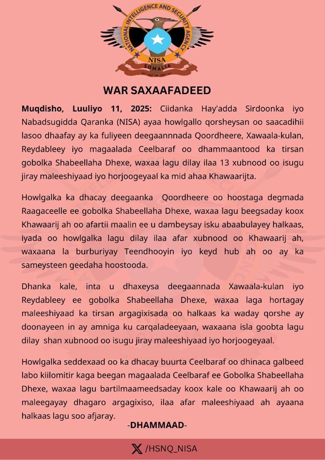 Jimco, Luulyo 10, 2025 (HOL) – Ciidamada Hay’adda Sirdoonka iyo Nabadsugidda Qaranka (NISA) ayaa qaaday howlgallo qorsheysan oo ka dhacay deegaanno dhowr ah oo ka tirsan gobolka Shabeellaha Dhexe, kuwaas oo lagu dilay 13 xubnood oo ka tirsan kooxda Al Shabqab, oo ay ku jireen horjoogeyaal iyo maleeshiyaad.