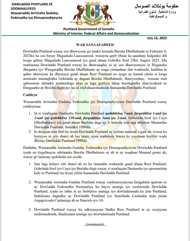 “Dowladda Puntland waxay si cad u sheegaysaa in aysan jirin sharci ay ku timid in Beesha Dhulbahante ay sameystaan maamul gaar ah,” ayaa lagu yiri warka.