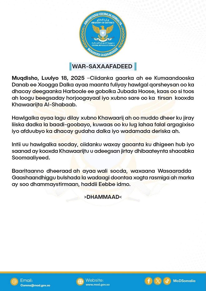 Wasaaradda Gaashaandhiga Soomaaliya ayaa Warsaxafadeedka ku sheegtay in howlgalka in khasaare dhimasho iyo dhaawaca leh lagu gaarsiiyay saraakiil sar sare iyo xubno ka tirsan maleeshiyaadka kooxda Al-shabaab.