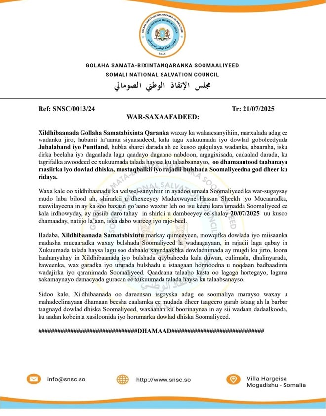 “Shirarkii u dhaxeeyay madaxweynaha iyo Mucaaradka, gaar ahaan kii u dambeeyay ee qabsoomay Shalay oo taariiqdu aheyd 20-ka bisha July wuxu kusoo dhamaaday natiijo la’aan iyo raja beel” ayaa lagu yiri Warsaxafadeedka kasoo baxay Xildhibaanada ku mideysan Golaha Samatabixinta Qaranka.