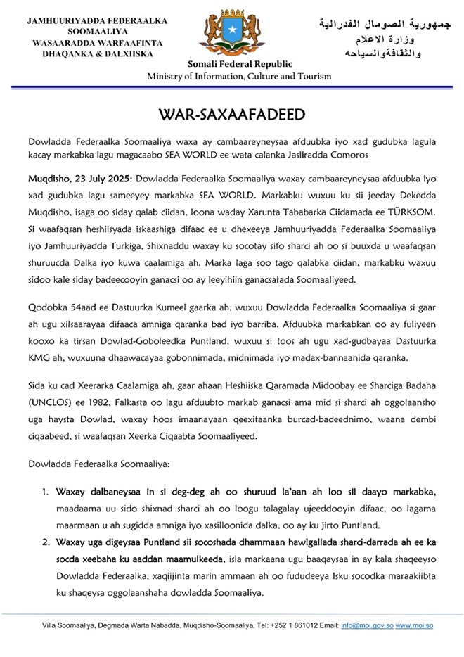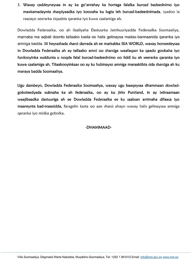 Dowladdu waxay dalbatay in si degdeg ah oo shuruud la’aan ah loo sii daayo markabka SEA WORLD, maaddaama sida ay sheegtay uu siday agab ciidan oo muhiim u ah amniga guud ee dalka. Sidoo kale, waxay uga digtay maamulka Puntland in uu sii wado hawlgallo sharci-darro ah oo ka socda xeebaha, iyadoo ugu baaqday in lala shaqeeyo dowladda dhexe si loo xaqiijiyo badqabka maraakiibta ku shaqeysa biyaha Soomaaliya.