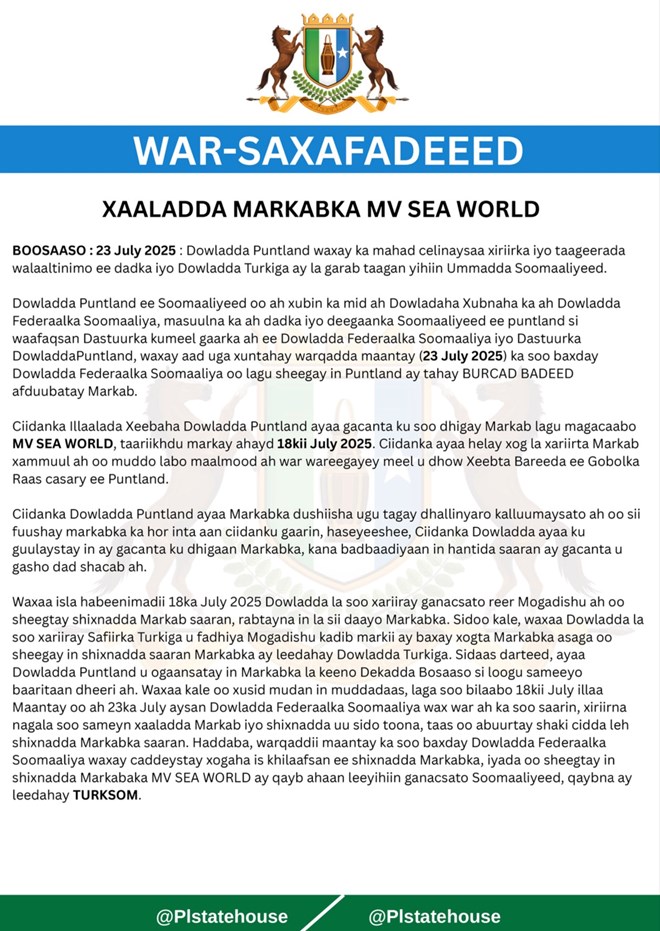 Puntland waxay geesta kale si adag u cambaareysay war kasoo baxay Dowladda Federaalka Soomaaliya kaaso ku saabsanaa inay Puntland afduubatay markabka MV Sea World. Waxay warkaasi ku tilmaantay mid aan sal iyo raad toona lahayn, islamarkaana ka turjumaya xog khaldan oo lagu suurad amniga xeebaha Puntland.