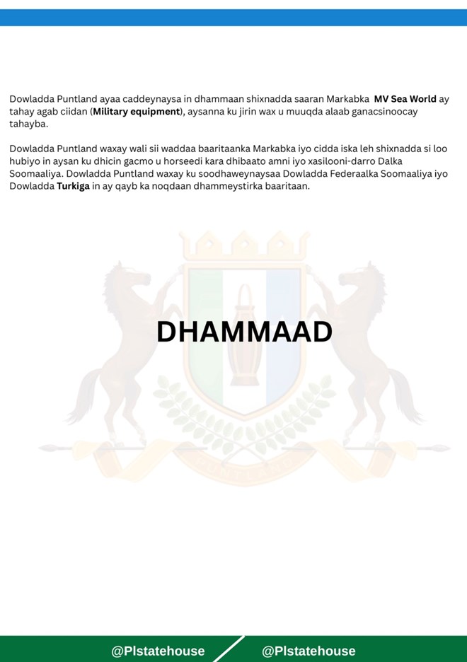 Ugu dambeyn, Puntland waxay ugu baaqday Dowladda Federaalka Soomaaliya iyo Dowladda Turkiga inay si buuxda uga qeyb qaataan dhameystirka baaritaanka ku socda markabka, si loo caddeeyo cidda iska leh shixnadda hubka ah.