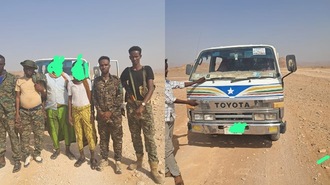 Ciidanka amniga ayaa soo bandhigay labo nin oo dhalinyaro ah iyo gaariga, kuwaas oo ay ciidamadu ku qabteen nawaaxiga halka loo yaqaano Biyo kulule oo uu dhaxeeya Boosaaso iyo Baallade.
