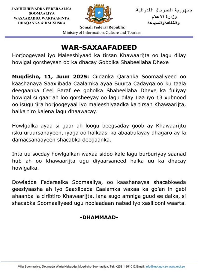 Arbaco, Juun 11, 2025 (HOL) – Ciidanka Xoogga Dalka Soomaaliyeed oo gacan ka helaya saaxiibada caalamiga ah ayaa howlgal qorsheysan ka fuliyay deegaanka Buurta Cadayga oo ku dhow Ceel Baraf, gobolka Shabeellaha Dhexe.