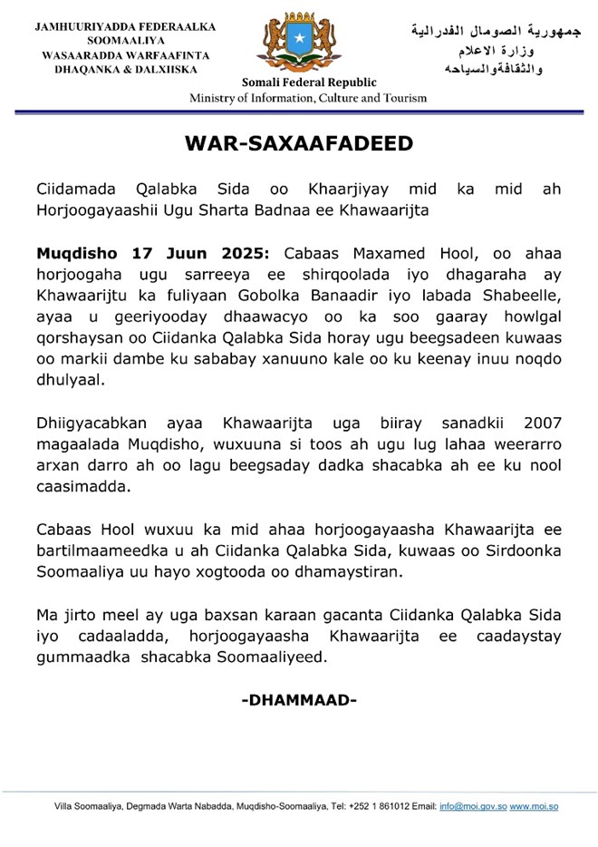 Warka kasoo baxay wasaaradda ayaa lagu soo gabagabeeyay inaysan jirin meel ay uga baxsan karaan gacanta Ciidanka Qalabka Sida iyo cadaaladda, horjoogayaasha Kooxda Al-shabaab.