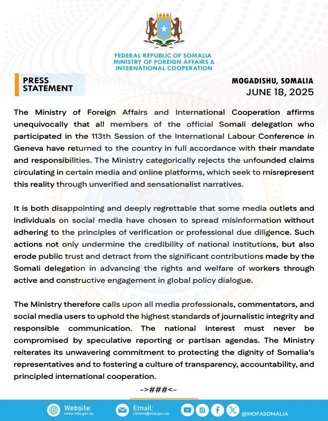 Khamiis, Juun 19, 2025 (HOL) – Wasaaradda Arrimaha Dibadda iyo Iskaashiga Caalamiga ah ayaa si adag u beenisay warar lagu faafiyay qaar ka mid ah warbaahinta iyo baraha bulshada oo sheegayay in xubno ka mid ah ergadii Soomaaliya ee ka qeyb gashay Shirkii 113aad ee Shaqada Adduunka ee ka dhacay magaalada Geneva ay dalka dib ugu soo noqon waayeen.