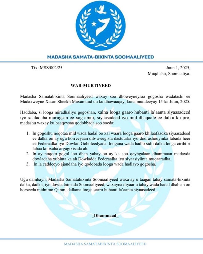 Ugu dambayn, Madasha Samatabixinta Soomaaliyeed ee Mucaaradka ayaa sheegay inay u taagan yihiin samata-bixinta dalka, dadka, iyo dowladnimada Soomaaliyeed, waxayna xuseen inay diyaar u yihiin wada hadal dhab ah oo horseeda midnimo Qaran, dalkana looga saaro hubanti la’aanta siyaasadeed.