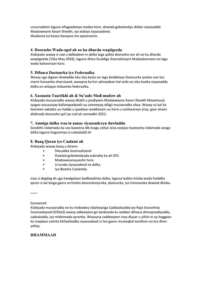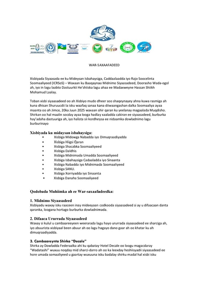 Sabti, Juun 21, 2025 (HOL) – 10 xisbi Siyaasadeed oo ku Mideysan Isbahaysiga, Caddaaladda iyo Rajo Soocelinta Soomaaliyeed (ICRSOS) ayaa ka horyimid inta badan qodobadii laga soo saaray Shirkii Gogoshada wadatashiga ee horey uu iclaamiyay Madaxweynaha Soomaaliya laguna soo gabagabeeyay magaalada Muqdisho.