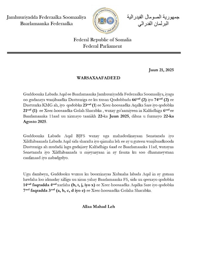 War saxaafadeed ay soo saareen maanta ayay ku sheegeen in Guddoonka Labada Aqal ee Baarlamaanka Jamhuuriyadda Federaalka Soomaaliya, iyaga oo gudanaya waajibaadka Dastuuriga ee ku xusan Qodobbada 66d (2) iyo 74d (2) cc Dastuurka KMG ah, iyo qodobka 23 (1) ee Xeer-hoosaadka Aqalka Sare iyo qodobka 21d (1) ee Xeer-hoosaadka Golah Shacabka, ay go’aamiyeen in Kalfadhiga 6 ee Baarlamaanka 1aad uu xirmayo taariikh 22-ka Juun 2025.