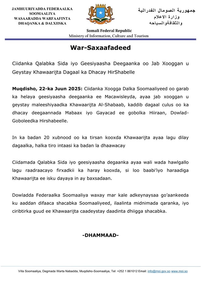 “Dowladda Federaalka Soomaaliya waxay mar kale adkeynaysaa go’aankeeda ku aaddan difaaca shacabka Soomaaliyeed, ilaalinta midnimada qaranka, iyo ciribtirka guud ee Khawaarijta caadeystay daadinta dhiigga shacabka” ayaa lagu yiri Warsaxafadeedka kasoo baxay Wasaaradda Warfaafinta Soomaaliya.