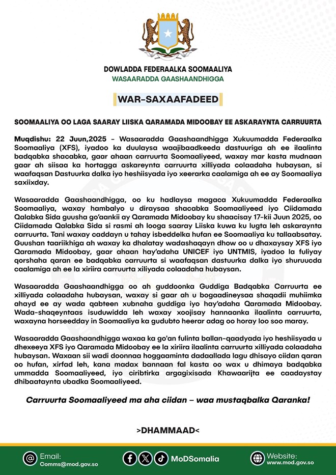“Wasaaradda Gaashaandhigga, oo ku hadlaysa magaca Xukuumadda Federaalka Soomaaliya, waxay hambalyo u diraysaa shacabka Soomaaliyeed iyo Ciidamada Qalabka Sida guusha go’aankii ay Qaramada Midoobay ku shaacisay 17-kii Juun 2025, 00 Ciidamada Qalabka Sida si rasmi ah looga saaray Liiska kuwa ku lugta leh askaraynta carruurta.”ayaa lagu yiri war saxafadeedka Wasaaradda.