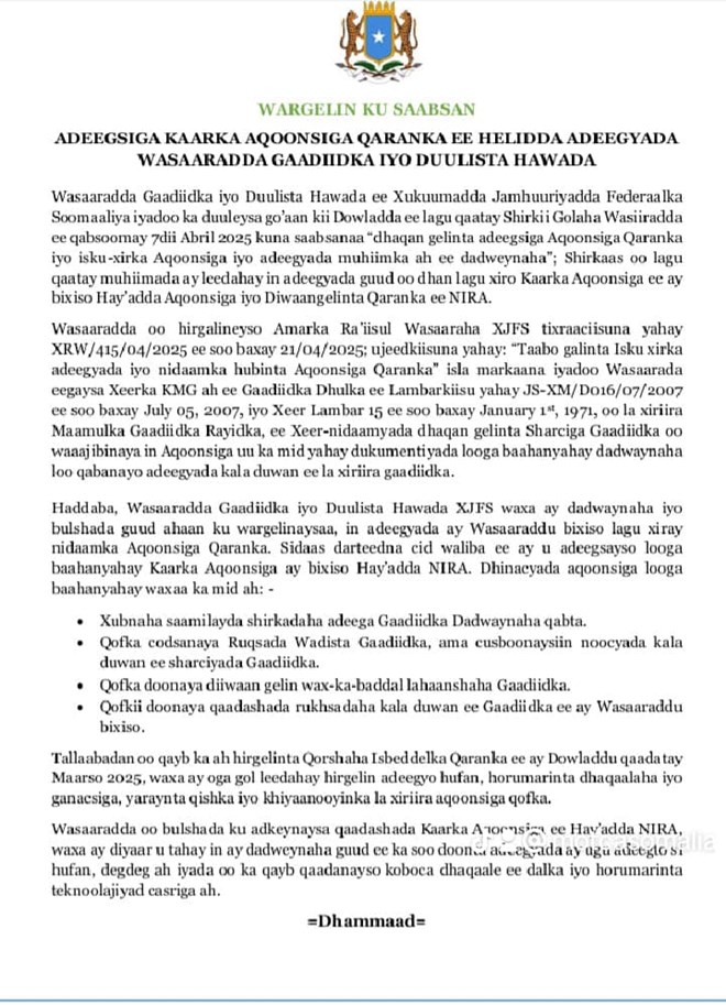 “Qof kasta oo doonaya in uu helo adeegyada ay bixiso Wasaaradda sida ruqsadaha darawalnimada, is-diiwaangelinta gaadiidka, ama adeegyo kale oo la xiriira gaadiidka, waxaa looga baahanyahay in uu haysto Kaarka Aqoonsiga Qaranka” ayaa lagu warsaxaafadeedka kasoo baxay Wasaaradda Gaadiidka Duulista iyo Hawada Soomaaliya.