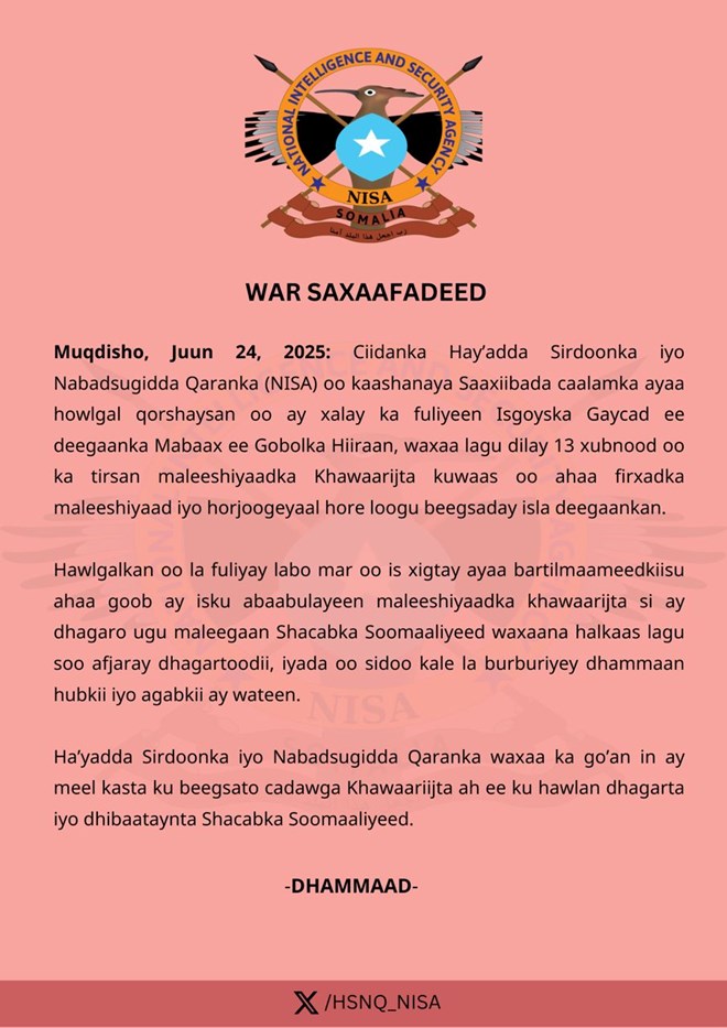 Talaado, Juun 24, 2025 (HOL) – Ciidanka Hay’adda Nabadsugidda iyo Sirdoonka Qaranka Soomaaliyeed ee NISA oo kaashanaya kuwa saaxiibada Caalamka ayaa Xalay howlgal qorshaysan oo lagu dilay xubno ka tirsan Al-shabaab ka fuliyay  isgoyska Gaycad ee deegaanka Mabaax ee gobolka Hiiraan.