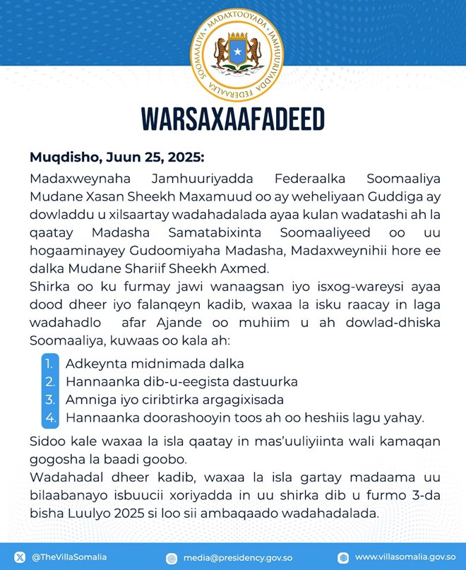 Arbaco, Juun 25, 2025 (HOL) – Shir u dhaxeeya Madaxweynaha Soomaaliya Xasan Sheekh Maxamuud iyo Madasha Samatabixinta Soomaaliyeed ayaa maanta ka furmay magaalada Muqdisho sida ay sheegtay madaxtooyada Soomaaliya.