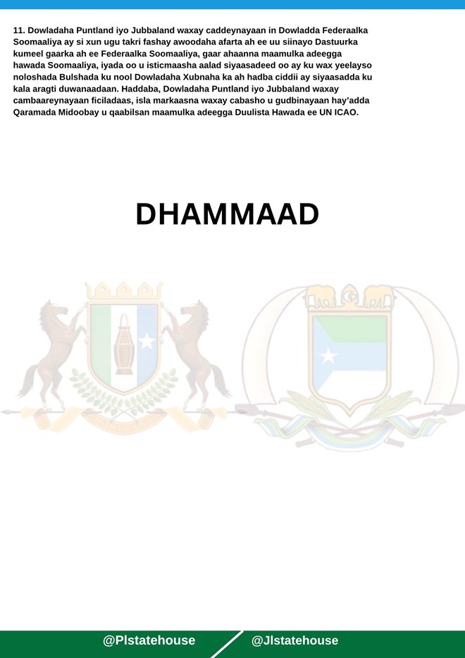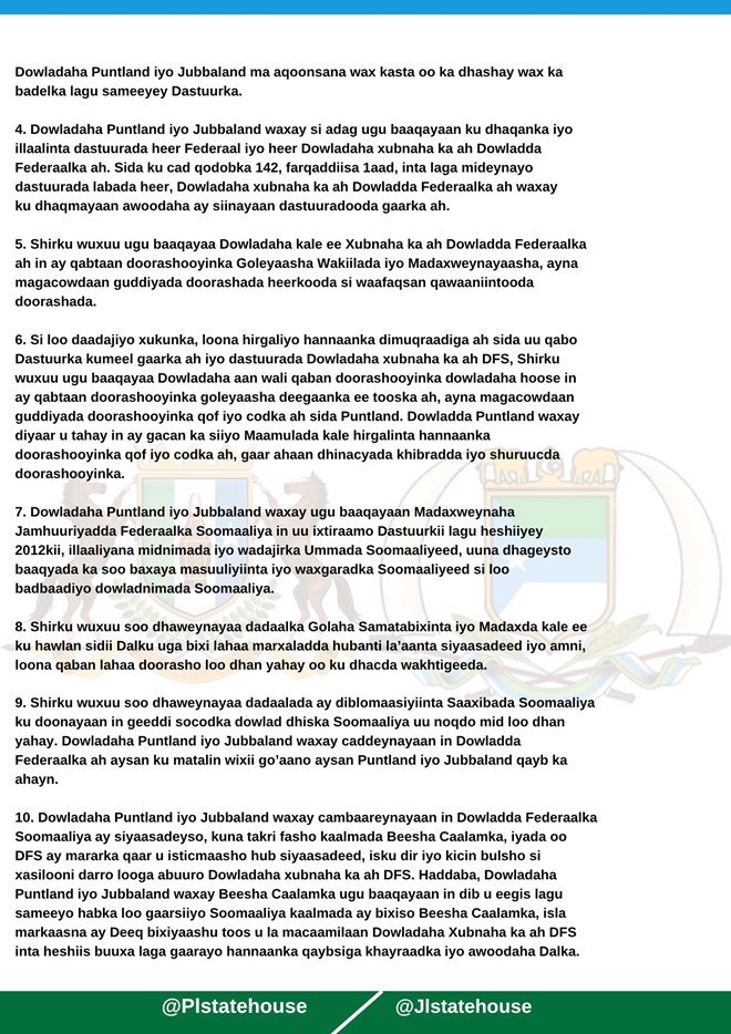 Ugu dambeyntii, labada madaxweyne waxay ugu baaqeen Madaxweynaha Soomaaliya inuu ixtiraamo dastuurka lagu heshiiyay, isla markaana dalka laga qabto doorasho heshiis lagu yahay. Waxay sidoo kale sheegeen in haddii arrimahaasi la waayo, Puntland iyo Jubbaland ay ku dhaqmi doonaan awoodaha uu siinayo dastuuradooda u gaarka ah.