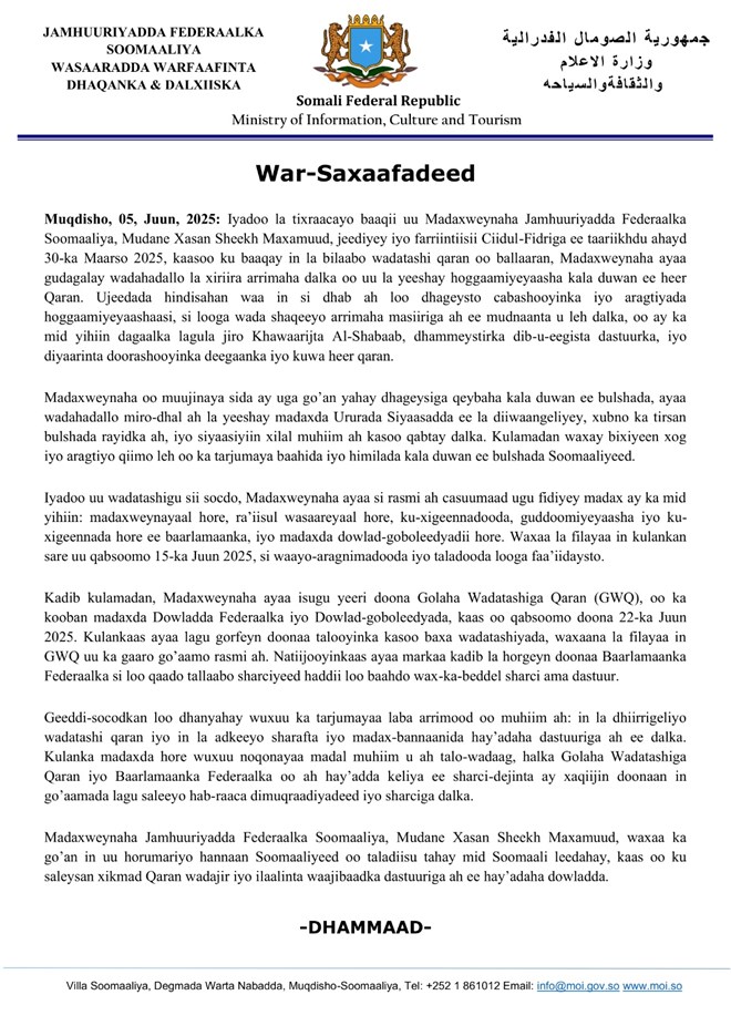 “Iyadoo uu wadatashigu sii socdo, Madaxweynaha ayaa si rasmi ah casuumaad ugu fidiyey madax ay ka mid yihiin: madaxweynayaal hore, ra’iisul wasaareyaal hore, ku-xigeennadooda, guddoomiyeyaasha iyo ku-xigeennada hore ee baarlamaanka, iyo madaxda dowlad-goboleedyadii hore. Waxaa la filayaa in kulankan sare uu qabsoomo 15-ka Juun 2025, si waayo-aragnimadooda iyo taladooda looga faa’iidaysto” ayaa lagu yiri Warsaxafadeedka kasoo baxay Wasaaradda Warfaafinta Soomaaliya.