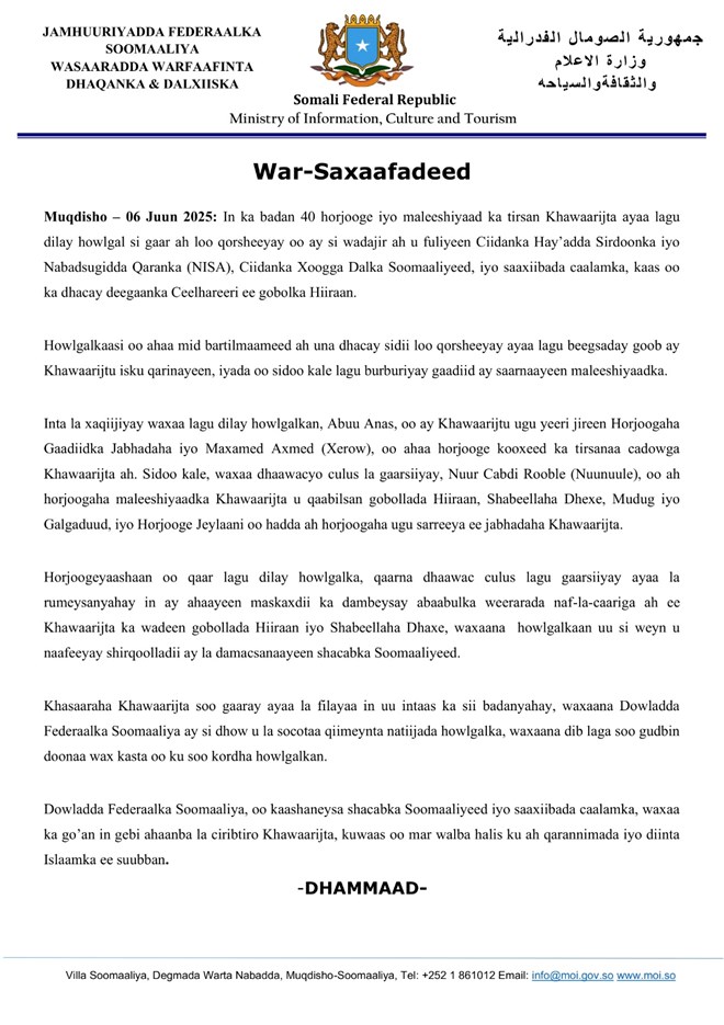 “Inta la xaqiijiyay waxaa lagu dilay howlgalkan, Abuu Anas, oo ay Khawaarijtu ugu yeeri jireen Horjoogaha Gaadiidka Jabhadaha iyo Maxamed Axmed (Xerow), oo ahaa horjooge kooxeed ka tirsanaa cadowga Khawaarijta ah. Sidoo kale, waxaa dhaawacyo culus la gaarsiiyay, Nuur Cabdi Rooble (Nuunuule), oo ah horjoogaha maleeshiyaadka Khawaarijta u qaabilsan gobollada Hiiraan, Shabeellaha Dhexe, Mudug iyo Galgaduud, iyo Horjooge Jeylaani oo hadda ah horjoogaha ugu sarreeya ee jabhadaha Khawaarijta” ayaa lagu yiri Warsaxafadeedka kasoo baxay Wasaaradda Warfaafinta Soomaaliya.