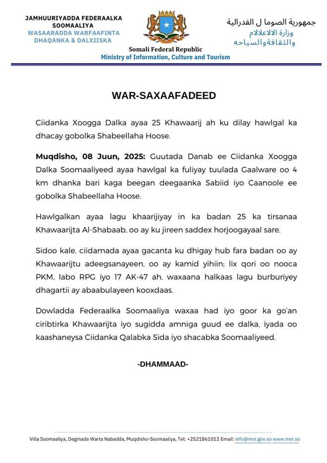 Isniin, Juun 9, 2025 (HOL) – Ciidanka sida gaarka ah u tababaran ee Kumaandooska Danab ayaa howlgal qorsheysan oo lagu dilay xubno badan oo ka tirsan kooxda Al-shabaab ka fuliyay deegaanka Gaalware oo qiyaas ahaan 4 KM dhanka bari kaga beegaan deegaanka Sabiid iyo Caanoole ee gobolka Shabeellaha Hoose.