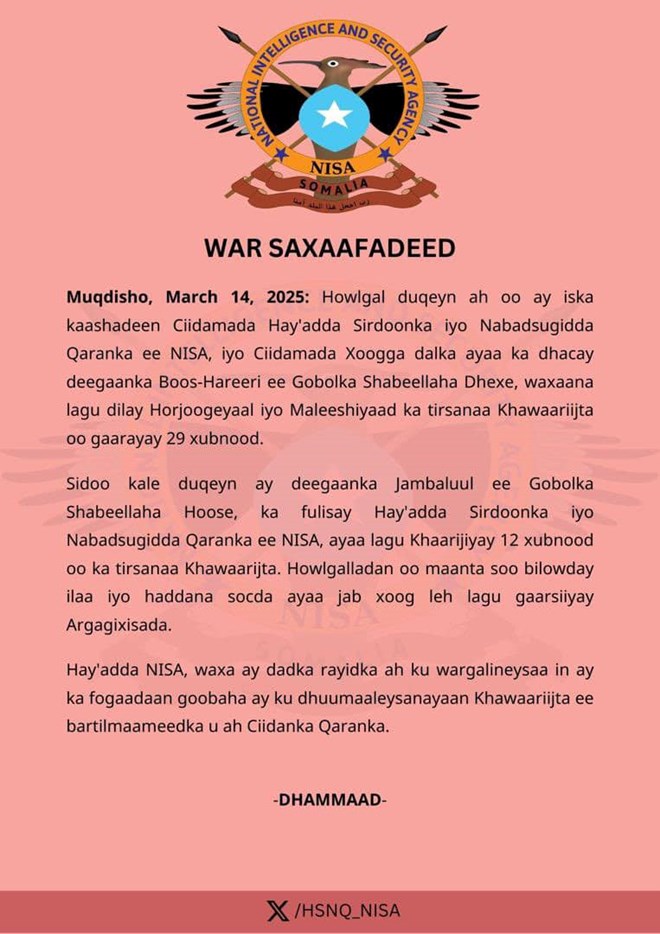 Bayaanka waxaa lagu yiri “Hay’adda Sirdoonka iyo Nabadsugidda Qaranka ee NISA, ayaa howlgal ay qaadeen lagu Khaarijiyay 12 xubnood oo ka tirsanaa Al shabaab.