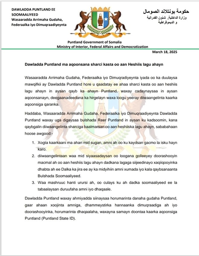 Wasaaradda Arrimaha Gudaha Puntland ayaa caddeysay in aysan aqoonsanayn, deegaanadeedana laga hirgelin karin diiwaangelinta kaarka aqoonsiga qaranka. Wasaaraddu waxay uga digtay shacabka Puntland in ay ka qaybqaataan barnaamijkan ay ku tilmaantay mid sharci-darro ah.