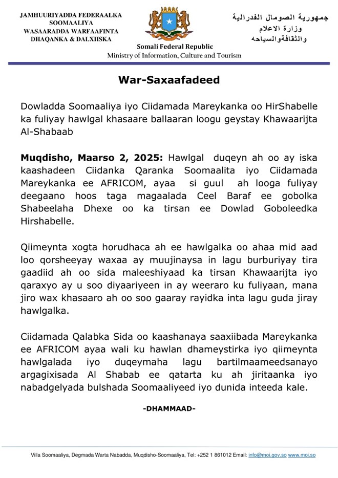 Ciidamada Qalabka Sida oo kaashanaya AFRICOM ayaa weli wada qiimeynta natiijada hawlgalka iyo dabagalka bartilmaameedyada kooxda Alshabaab, si loo xaqiijiyo badqabka shacabka iyo adkaynta amniga deegaannada la xoreeyay.