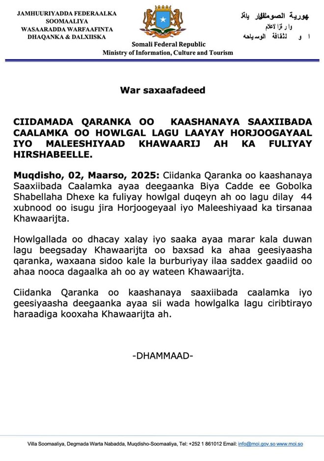 Axad, Maarso 2, 2025 (HOL) – Ciidamada dowladda Fedaraalka Soomaaliya oo kaashanaya kuwa saaxiibada Caalamka ayaa duqeymo culus oo lagu dilay horjoogayaal iyo Maleeshiyaad ka tirsan kooxda Al-shabaab ka fuliyay deegaanka Biyo Cadde ee gobolka Shabeellaha Dhexe.