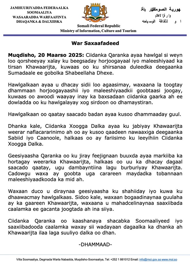 “Geesiyaasha Qaranka oo ku jiray feejignaan buuxda ayaa markiiba ka hortagay weerarka Khawaarijta, halkaas oo uu ka dhacay dagaal saacado qaatay, ugu dambayntiina lagu burburiyay Khawaarijta. Cadowgu waxa ay goobta uga carareen maydadka tobannaan maleeshiyaadkooda ka mid ah” ayaa lagu yiri Warsaxafadeedka.