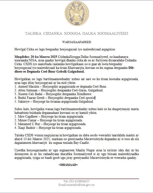 Jimco, Maarso 21, 2025 (HOL) – Taliska Militariga Soomaaliya ayaa war uu soo saaray ku faah faahiyay magacyada horjoogayaal iyo nabadoono ka tirsan Al shabaab oo saacadihii lasoo dhaafay lagu beegsaday bartamaha Soomaaliya.