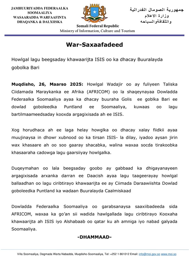 Warsaxafadeedka ayaa sidoo kale lagu xusay in duqeynta oo dhanka cirka aheyd, si gaar ah loola beegsaday goobo ay gabaad ka dhigayanayeen Daacish, islamarkaana duqeyntu ay aheyd mid lagu taageerayay howlgalada culus ee lagu ciribtirayo kooxda Daacish oo ay ka wadaan buuraleyda Calmiskaad ee gobolka Bari ciidamada Daraawiishta maamulka Puntland.