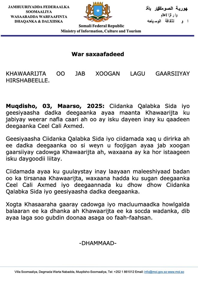 “Geesiyaasha Ciidanka Qalabka Sida iyo ciidamada xaq u dirirka ah ee dadka deegaanka oo si weyn u foojigan ayaa jab xoogan gaarsiiyay cadowga Khawaarijta ah, waxaana ay ka hor istaageen isku daygoodii liitay. Ciidamada ayaa ku guulaystay inay laayaan maleeshiyaad badan oo ka tirsanaa Khawaarijta, waxaana hadda ku sugan deegaanka Ceel Cali Axmed iyo deegaannada ku dhow dhow Ciidanka Qalabka Sida iyo geesiyaasha dadka deegaanka” ayaa lagu yiri Warsaxafadeedka.