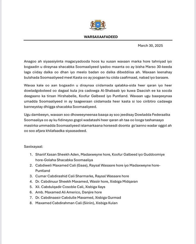 “Waxaan soo dhoweeyneenaa baaqa ay soo jeedisay Dowladda Federaalka Soomaaliya oo ay ku fidineyso gogol wadatashi heer qaran ah taa oo looga tashanaayo masiirka ummadda Soomaaliyeed islamarkaana horsesdi doonta go’aanno wadar oggol ah oo soo afjara khilafaadka siyaasadeed” ayaa lagu yiri war saxaafadeedka siyaasiyiintaan ay soo saareen.