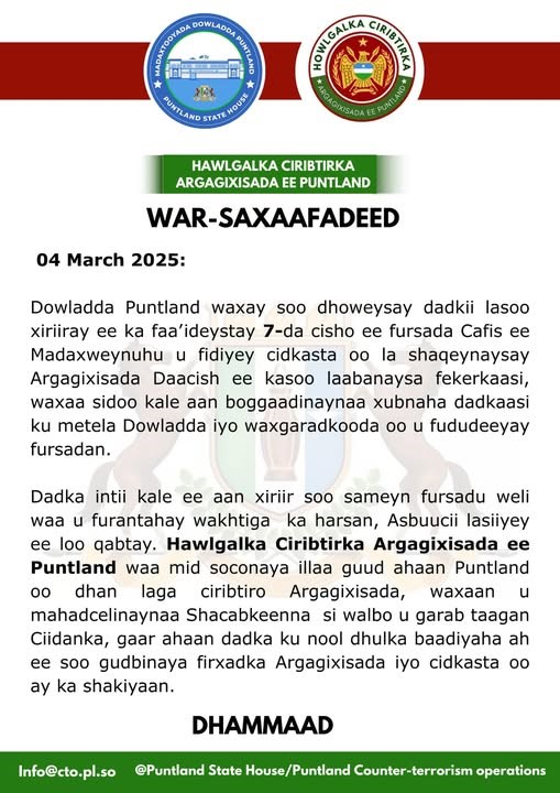 Talaado, Maarso 4, 2025 (HOL) – Puntland ayaa soo dhoweeysay dad lasoo xiriiray oo ka tirsanaa Daacish, kuwaas ka faa’iideystay cafiska uu u fidiyey madaxweyne Siciid Deni, taasoo loogu talagalay cid kasta oo hore ula shaqeynaysay kooxda Daacish, balse ka soo laabatay fikirkaasi.