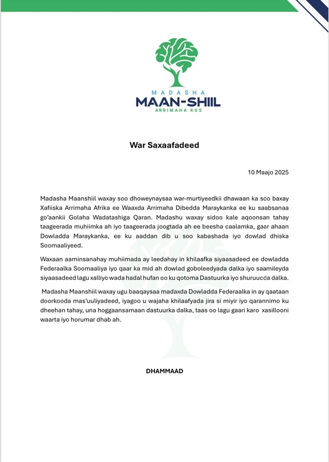 Ugu dambeyn, Madasha Maanshiil waxay ugu baaqday madaxda Dowladda Federaalka in ay qaataan doorkooda mas’uuliyadeed, iyagoo u wajaha khilaafyada jira si miyir iyo qarannimo ku dheehan tahay, una hoggaansamaan dastuurka dalka, taas oo lagu gaari karo xasillooni waarta iyo horumar dhab ah.