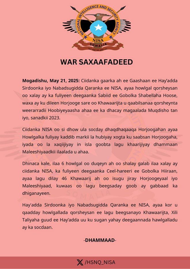 “Ciidanka NISA oo si dhow ula socday dhaqdhaqaaqa Horjoogahan ayaa Howlgalka fuliyay, kadib markii la hubiyay xogta ku saabsan Horjoogaha, iyada oo la xaqiijiyay in isla goobta lagu khaarijiyay dhammaan Maleeshiyaadkii ilaalada u ahaa” ayaa lagu yiri Warsaxafadeedka NISA.
